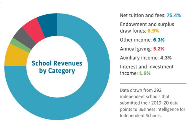 Net tuition and fees continue to be the primary source of income for independent schools — 75.4% of revenue, increasing from 72% in 2018-19. The percentage of revenue drawn from the endowment and surplus funds increased from 5.9% in 2018-19 to 6.9% in 2019-20. The proportion of revenue from interest and investment income decreased from 3.2% to 1.9%. Auxiliary income decreased from 5.6% to 4.3% of revenue.