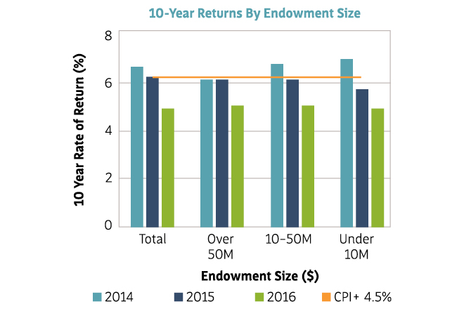 The chart below, showing 10-year returns, is concerning, as most schools have a 4 to 4.5 percent draw rate on their endowments. That, combined with the 10-year annualized Consumer Price Index (CPI) of 1.8 percent, creates a high hurdle for endowments to clear to both protect the principal and provide sufficient income to accommodate the budgeted draws. Schools are losing ground.