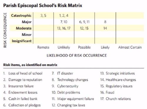 Although a risk matrix is the cornerstone of the ERM process, schools do not need to start with a blank sheet of paper. Parish Episcopal worked from one developed at a board member’s business. Schools can also find examples by contacting colleagues, consulting with their insurance brokers or taking advantage of resources from professional organizations like NBOA, including resources in the NBOA Library.