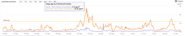 Monitoring particulate matter concentrations provided insight into both virus transmission as well as occupant health and wellness. In rooms with central HVAC systems (i.e. the Library, blue line in the image below), the particulate matter concentrations were consistently and considerably lower than rooms without central HVAC systems (i.e. Room 306, orange line below).