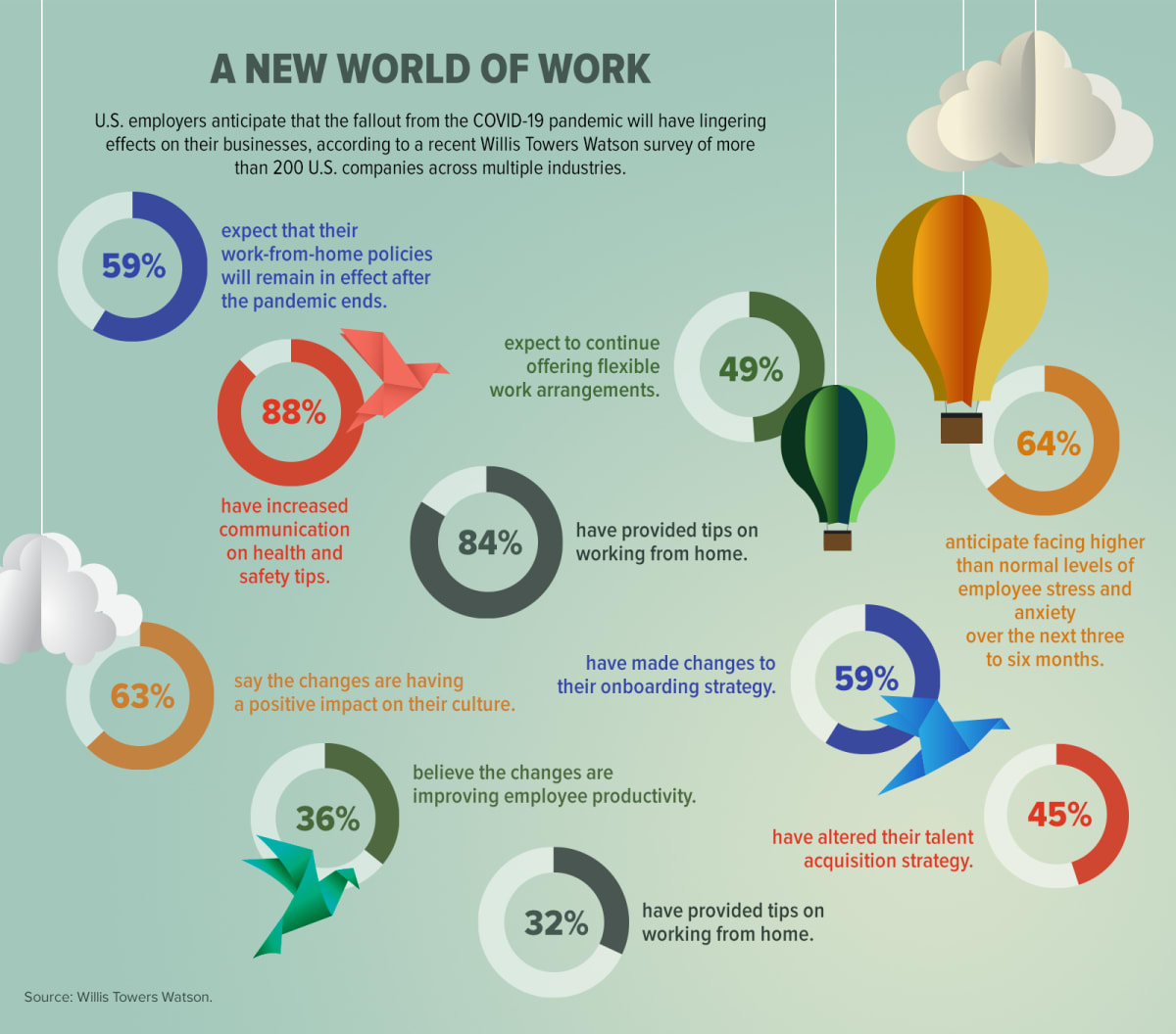 (From Willis Towers Watson) New research from global consultant Willis Towers Watson provides a glimpse into what the future of well-being, pay and work could look like. The data suggests that, In the short term, employees will be adversely impacted by heightened health concerns and general anxiety. However, regular communications and flexible working arrangements will help employees feel supported and coordinated in the long run (see below).